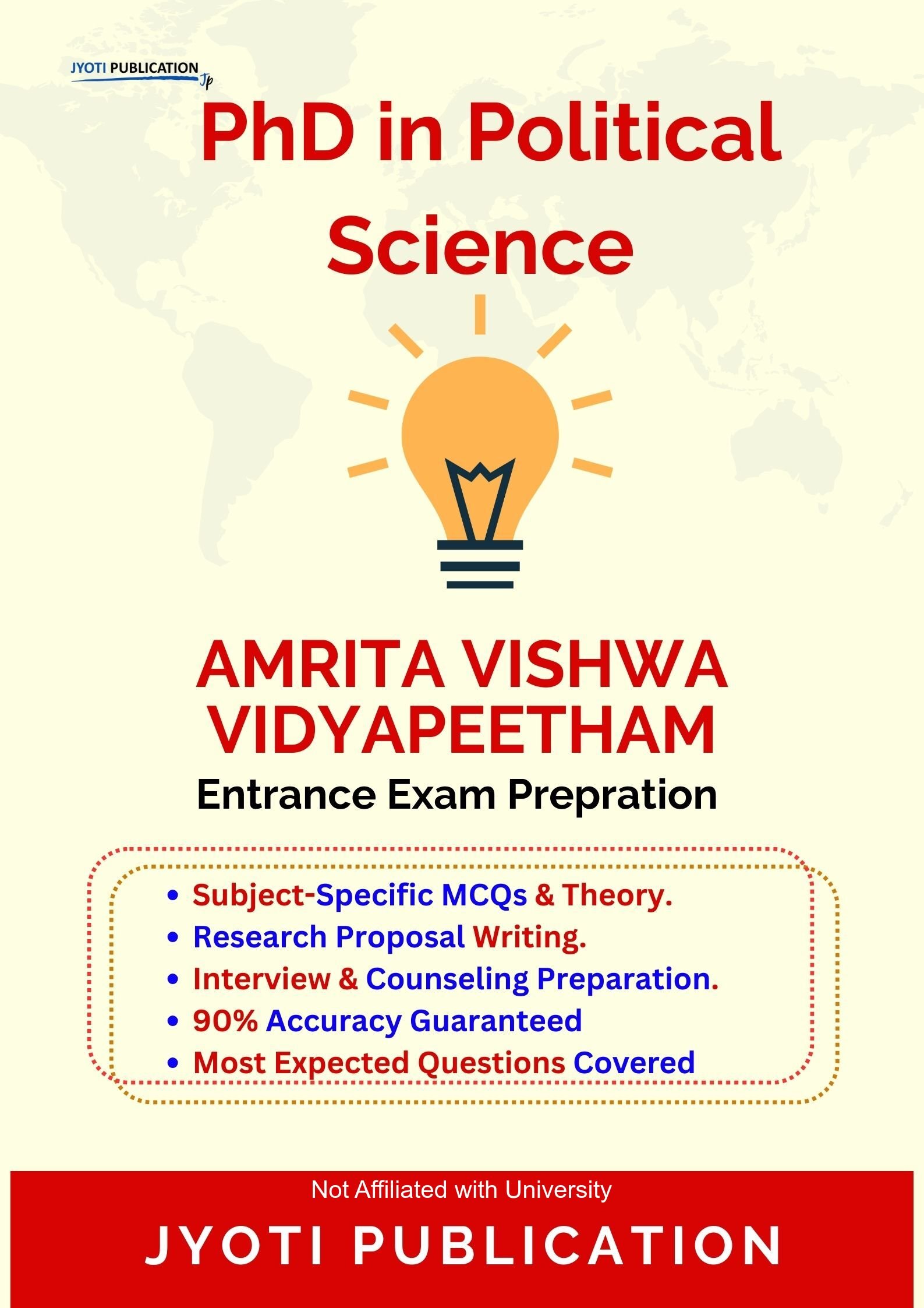 Amrita Vishwa Vidyapeetham PhD in Political Science Entrance Exam Preparation Guide is an independently developed study resource created to support aspirants preparing for the PhD in Political Science entrance examination conducted by Amrita Vishwa Vidyapeetham. The book is designed to help candidates understand concepts clearly, practise exam-oriented questions, and prepare in a structured and efficient manner.