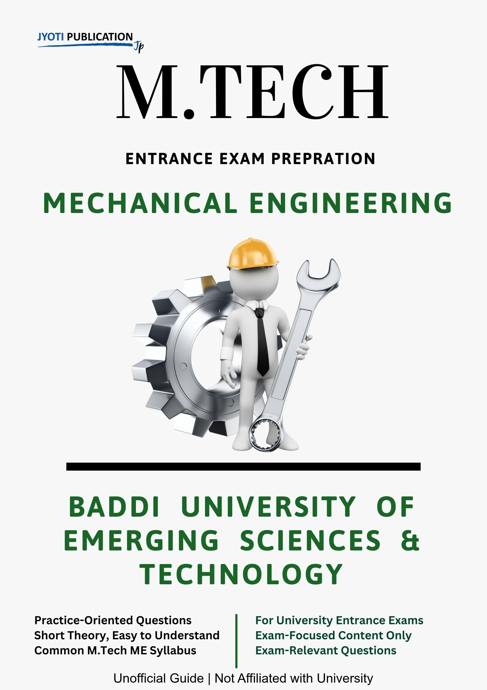 Baddi University of Emerging Sciences Technology M.Tech in Mechanical Engineering Entrance Exam Preparation Guide is an independently developed study resource created to support aspirants preparing for the M.Tech in Mechanical Engineering entrance examination conducted by Baddi University of Emerging Sciences Technology. The book is designed to help candidates understand concepts clearly, practise exam-oriented questions, and prepare in a structured and efficient manner.