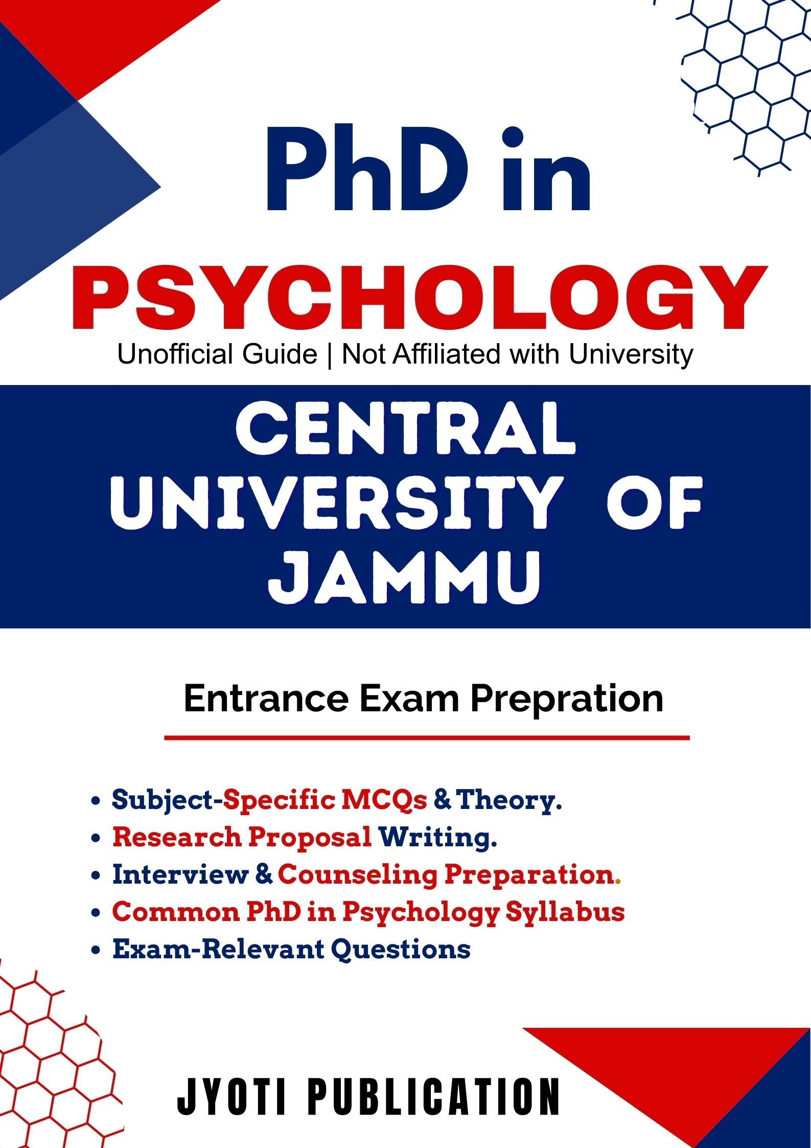 Central University of Jammu PhD in Psychology Entrance Exam Preparation Guide is an independently developed study resource created to support aspirants preparing for the PhD in Psychology entrance examination conducted by Central University of Jammu. The book is designed to help candidates understand concepts clearly, practise exam-oriented questions, and prepare in a structured and efficient manner.
