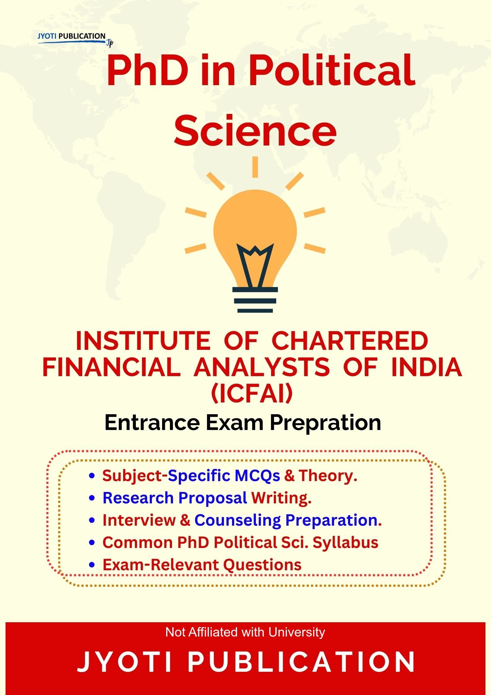 Institute of Chartered Financial Analysts of India ICFAI PhD in Political Science Entrance Exam Preparation Guide is an independently developed study resource created to support aspirants preparing for the PhD in Political Science entrance examination conducted by Institute of Chartered Financial Analysts of India ICFAI. The book is designed to help candidates understand concepts clearly, practise exam-oriented questions, and prepare in a structured and efficient manner.