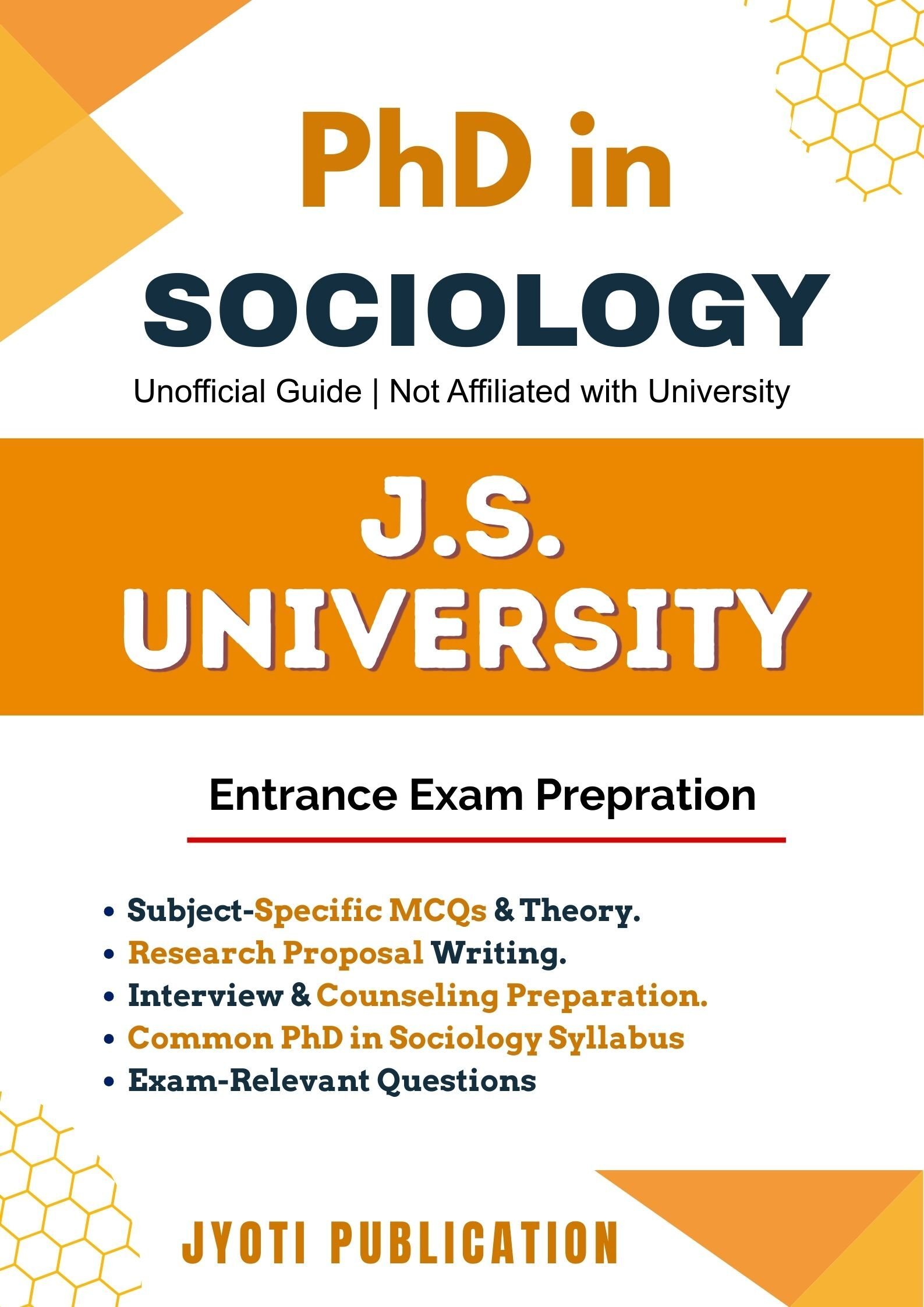 J.S. University PhD in Sociology Entrance Exam Preparation Guide is an independently developed study resource created to support aspirants preparing for the PhD in Sociology entrance examination conducted by J.S. University. The book is designed to help candidates understand concepts clearly, practise exam-oriented questions, and prepare in a structured and efficient manner.
