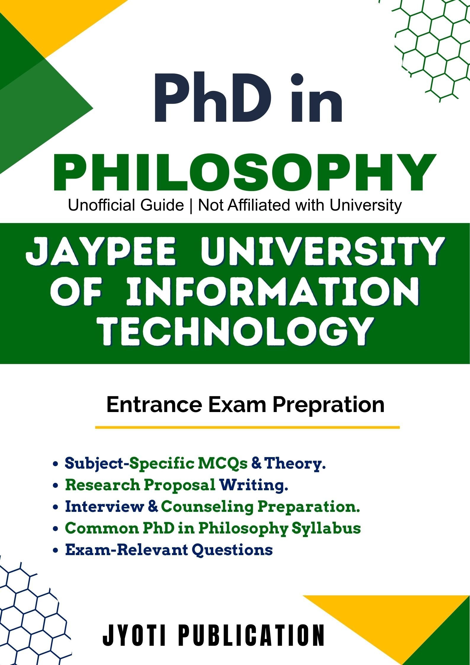 Jaypee University of Information Technology PhD in Philosophy Entrance Exam Preparation Guide is an independently developed study resource created to support aspirants preparing for the PhD in Philosophy entrance examination conducted by Jaypee University of Information Technology. The book is designed to help candidates understand concepts clearly, practise exam-oriented questions, and prepare in a structured and efficient manner.