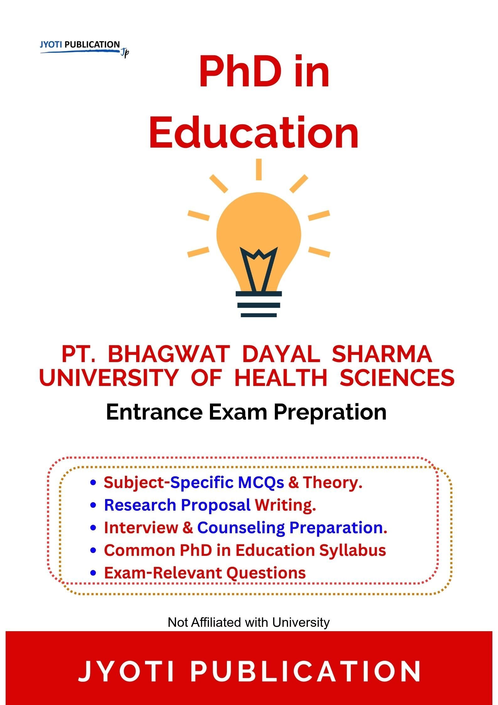 Pt. Bhagwat Dayal Sharma University of Health Sciences PhD in Education Entrance Entrance Exam Preparation Guide is an independently developed study resource created to support aspirants preparing for the PhD in Education Entrance entrance examination conducted by Pt. Bhagwat Dayal Sharma University of Health Sciences. The book is designed to help candidates understand concepts clearly, practise exam-oriented questions, and prepare in a structured and efficient manner.