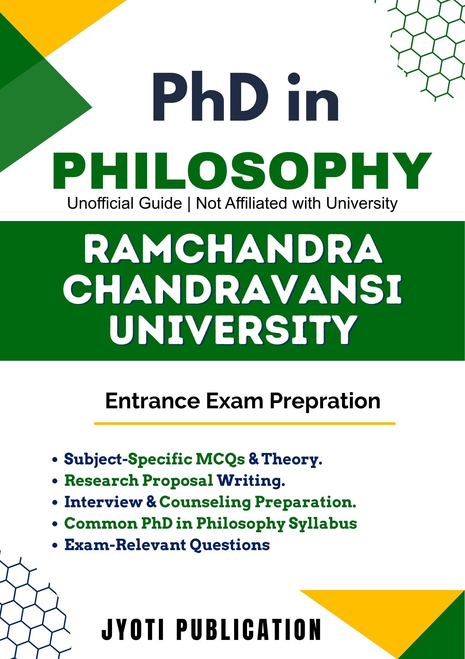 Ramchandra Chandravansi University PhD in Philosophy Entrance Exam Preparation Guide is an independently developed study resource created to support aspirants preparing for the PhD in Philosophy entrance examination conducted by Ramchandra Chandravansi University. The book is designed to help candidates understand concepts clearly, practise exam-oriented questions, and prepare in a structured and efficient manner.