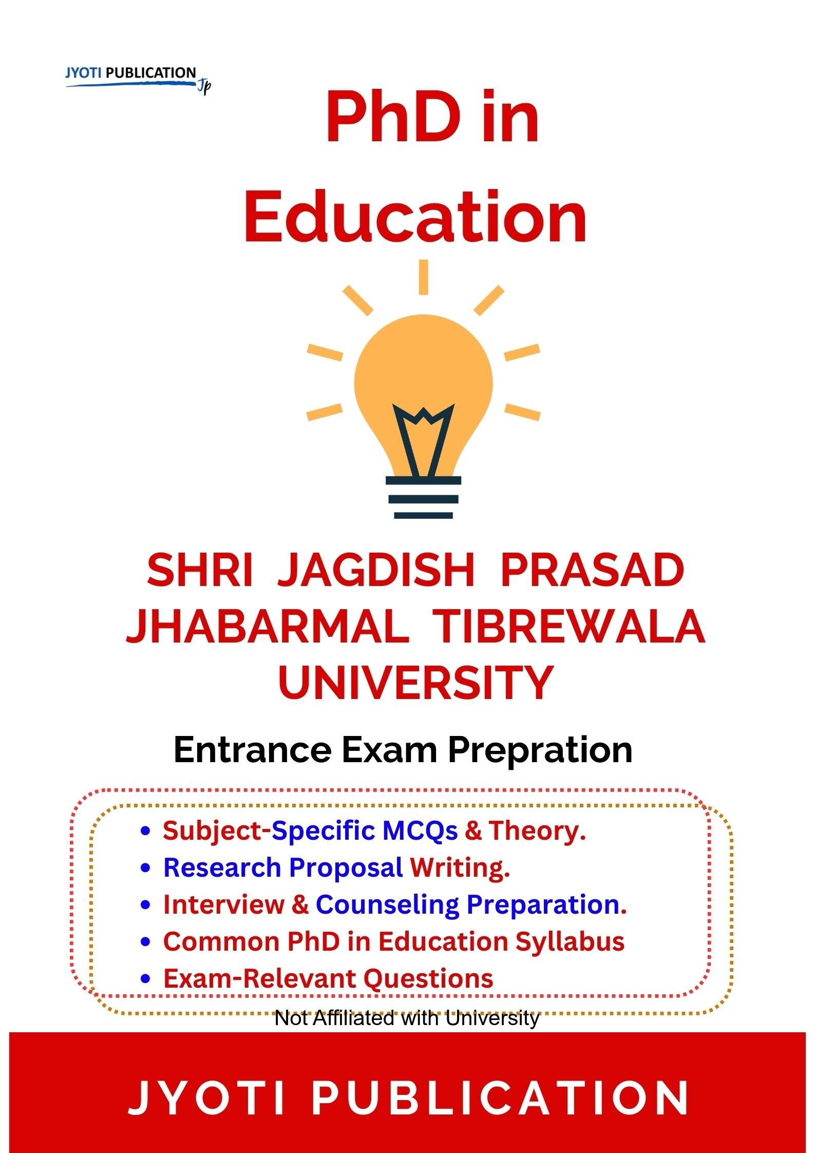 Shri Jagdish Prasad Jhabarmal Tibrewala University PhD in Education Entrance Entrance Exam Preparation Guide is an independently developed study resource created to support aspirants preparing for the PhD in Education Entrance entrance examination conducted by Shri Jagdish Prasad Jhabarmal Tibrewala University. The book is designed to help candidates understand concepts clearly, practise exam-oriented questions, and prepare in a structured and efficient manner.