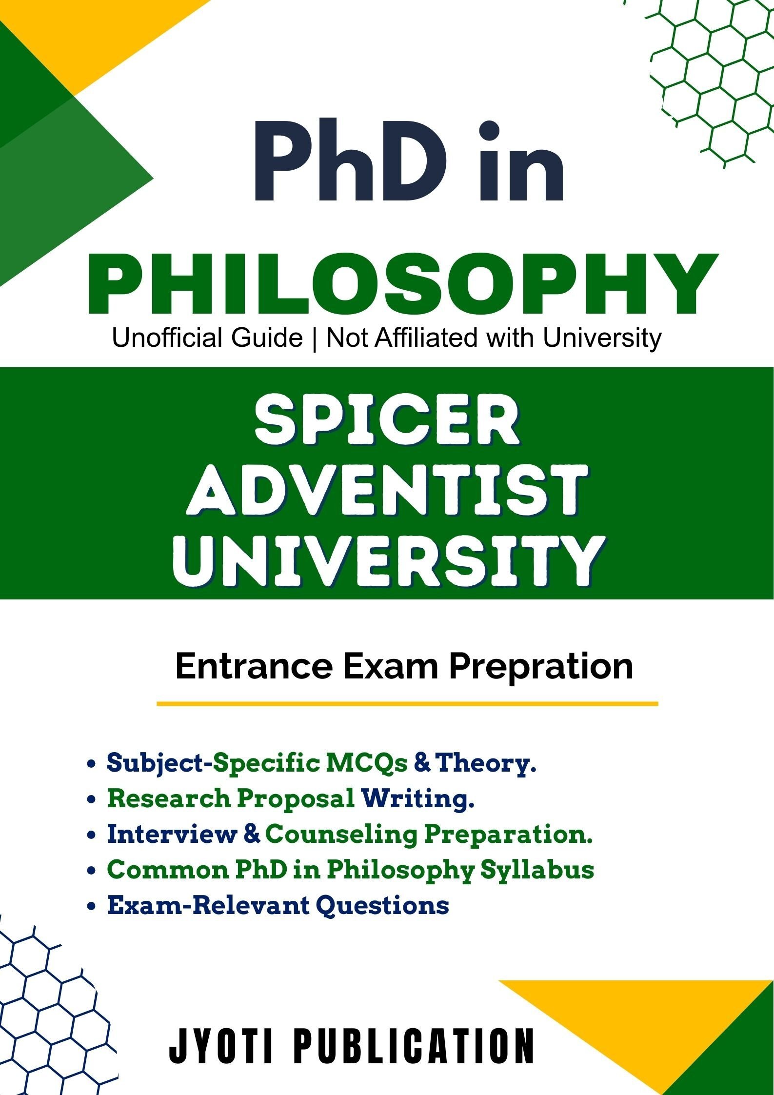 Spicer Adventist University PhD in Philosophy Entrance Exam Preparation Guide is an independently developed study resource created to support aspirants preparing for the PhD in Philosophy entrance examination conducted by Spicer Adventist University. The book is designed to help candidates understand concepts clearly, practise exam-oriented questions, and prepare in a structured and efficient manner.