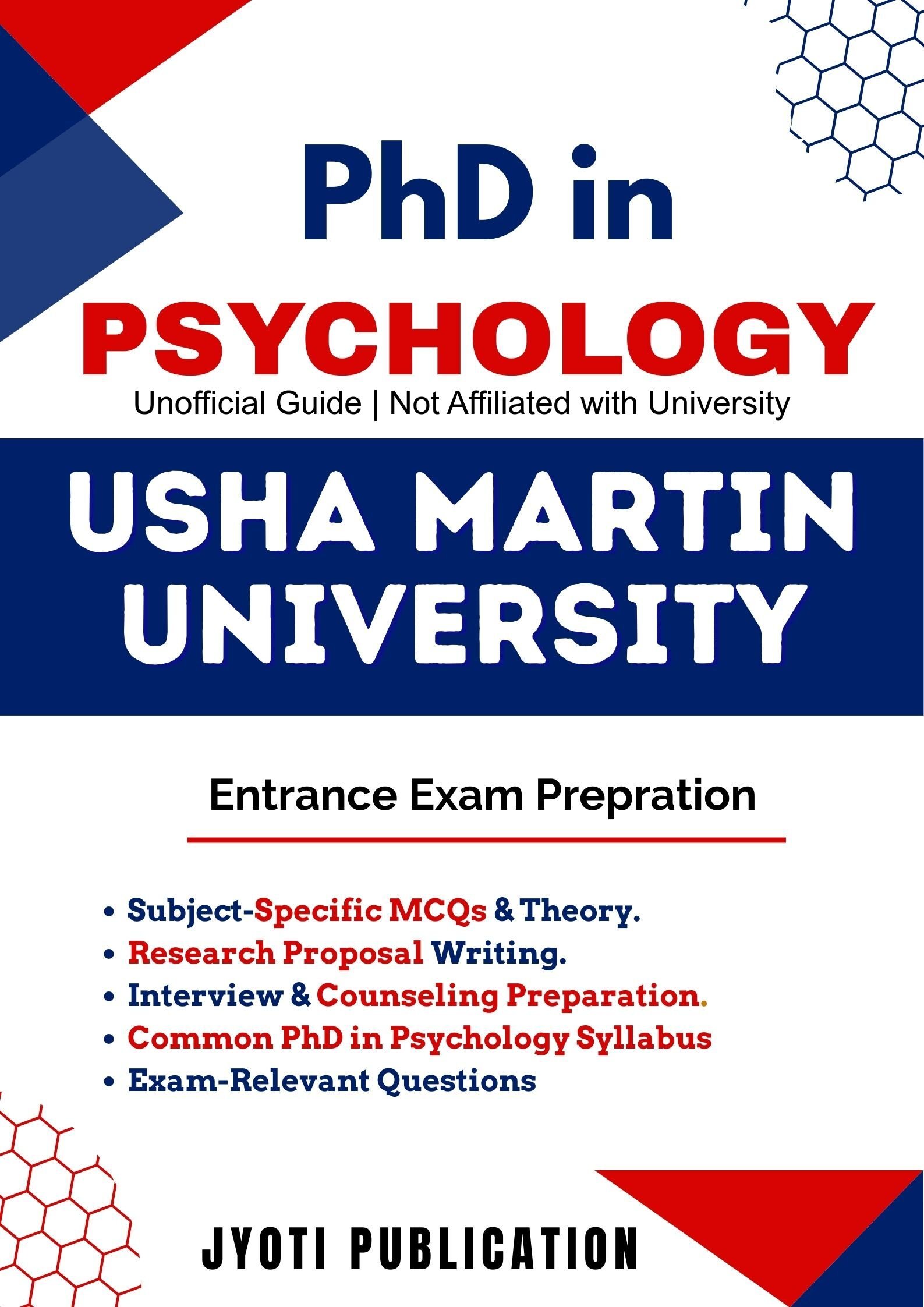Usha Martin University PhD in Psychology Entrance Exam Preparation Guide is an independently developed study resource created to support aspirants preparing for the PhD in Psychology entrance examination conducted by Usha Martin University. The book is designed to help candidates understand concepts clearly, practise exam-oriented questions, and prepare in a structured and efficient manner.